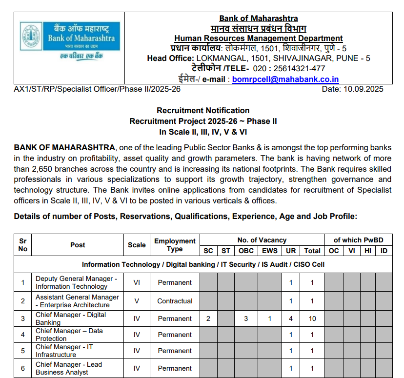 - अर्जदारांनी त्यांचे अर्ज www.bankofmaharashtra.in/current-openings वर सादर करावेत.