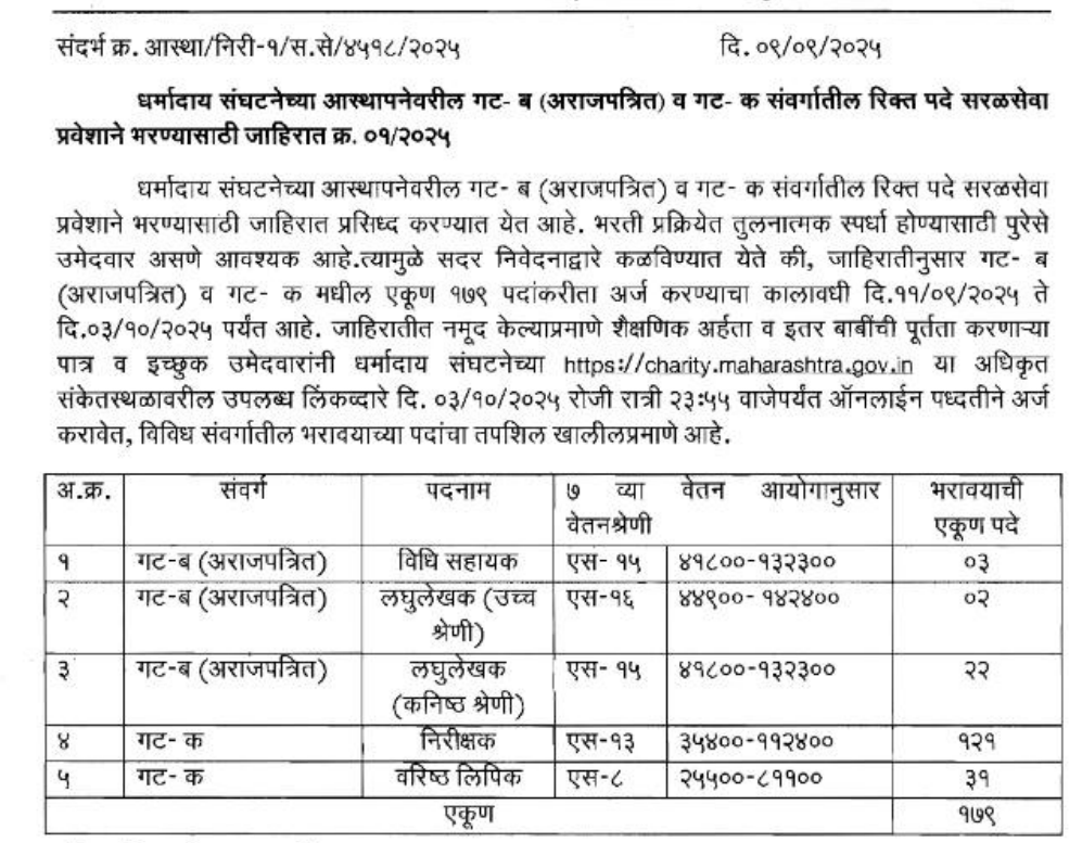 Maharashtra Charity Commissioner Recruitment 2025 :- धर्मादाय आयुक्त,महाराष्ट्र राज्य,मुंबई अंतर्गत गट ब (अराजपत्रित) व गट क संवर्गातील विविध रिक्त पदे सरळसेवा पद्धतीने भरण्यासाठी पात्र उमेदवारांकडून अर्ज मागविण्यात येत आहेत.