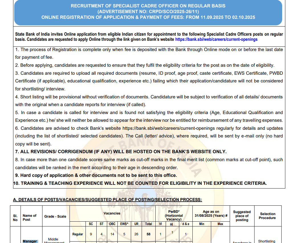 State Bank of India Recruitment 2025 :-स्टेट बँक ऑफ इंडिया स्पेशलिस्ट कॅडर ऑफिसर्स पदांसाठी नियमित आधारावर नियुक्तीसाठी पात्र भारतीय नागरिकांकडून ऑनलाइन अर्ज मागवत आहे.